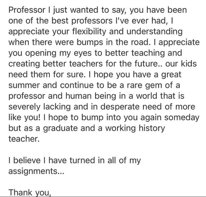 Figure 1. End-of-term message from a student in Teaching Literacy Across the Curriculum, a course for pre-service teachers outside literacy/reading specialization (including band, orchestra, choir, dance, theatre, and other electives).